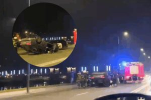 В центре Каунаса столкнулись автомобили, один из них перевернулся
