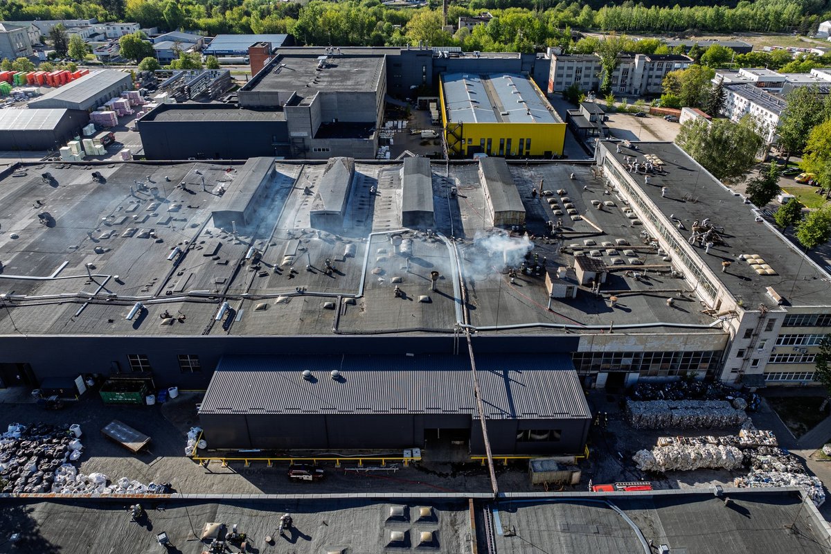 Дежурный оперативно-координационного отделения Департамента пожарной охраны и спасения сообщил, что сообщение о пожаре на проспекте Саванорю поступило в 16:15. По предварительным данным, загорелась крыша завода „Пласта“. На место происшествия были направлены семь автоцистерн и два автоподъемника.