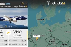 „Самолет отличается необычной расцветкой, так его выкрасили по случаю 100-летия компании. Темно-синий фюзеляж, большой белый журавль и дата отражают многолетнюю историю бренда“, – пишет Вильнюсский …