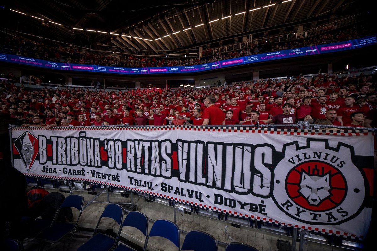 Болельщики Ритас развернули баннер с силуэтами трёх литовских политиков — Ремигиюса Жемайтайтиса, Инги Ругинене и президента Гитанаса Науседы.